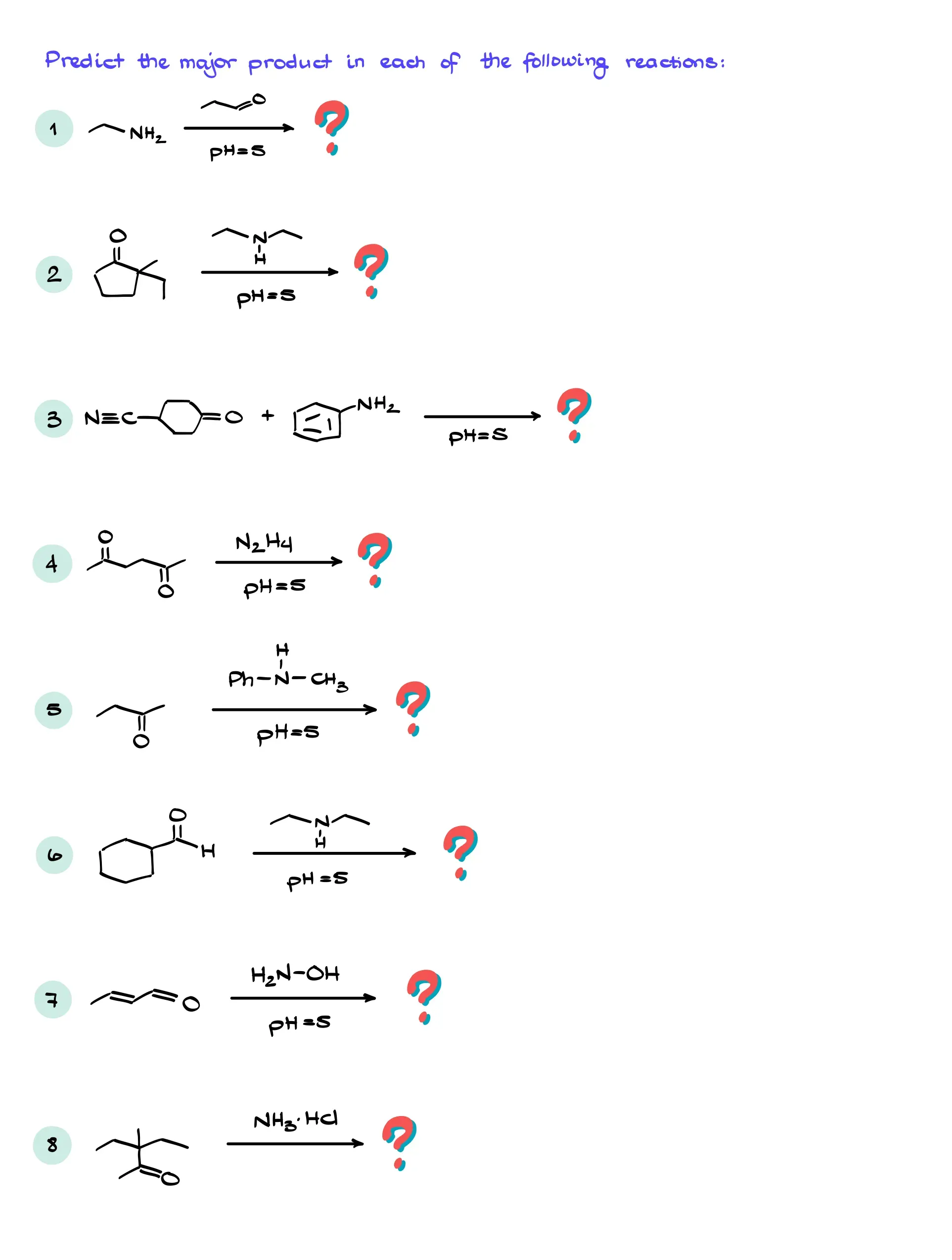 The reaction is catalyzed by a very small quantity of an acid. So, typically, we are going to show it as a pH=5. A very small amount of acid here is quite strategic. Any larger quantity would make your amine non-nucleophilic since the nitrogen of the amine will be protonated. Any smaller quantity — and your reaction will be rather slow and inefficient.