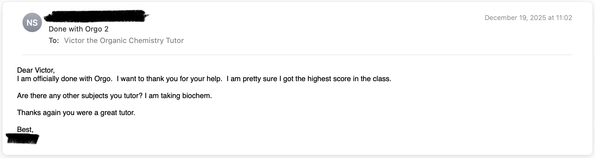 Good morning. I just received my grade for the semester. A! I would like to thank you for all your help this past year. I never thought Orgo would go so smoothly for me. You are an amazing tutor! I’m looking forward to continuing lessons in the future! Thank you so much once again!