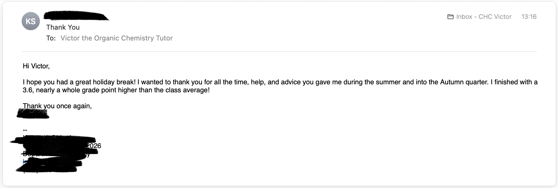 Overall, I’m very happy with Victor’s tutoring. He’s an amazing tutor and I’ll be recommending Victor to every chemistry student that I come across in the future!