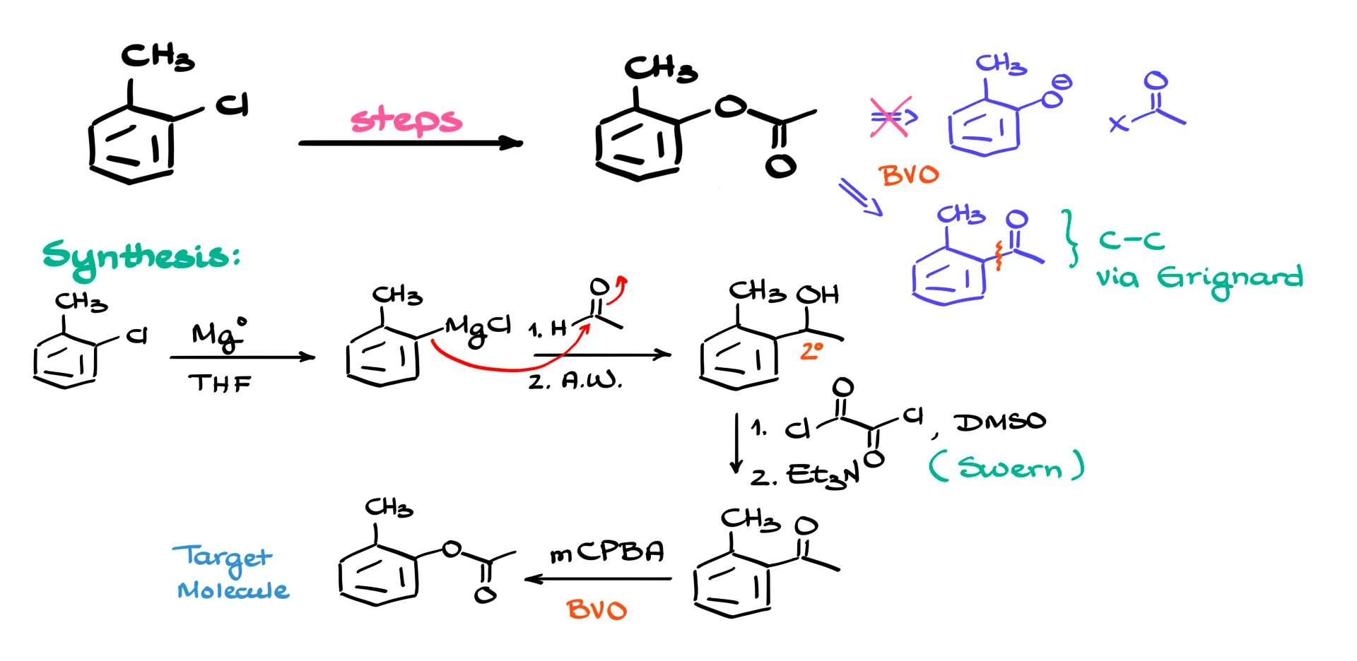 There is, however, a reliable alternative: the Baeyer–Villiger oxidation. This reaction allows us to insert an oxygen between the aromatic ring and the carbonyl. That points us toward building the ketone. And since we want to introduce a two-carbon fragment, forming a new carbon–carbon bond with a Grignard reagent is a straightforward way to do it. After that, oxidation of the secondary alcohol will give the ketone.