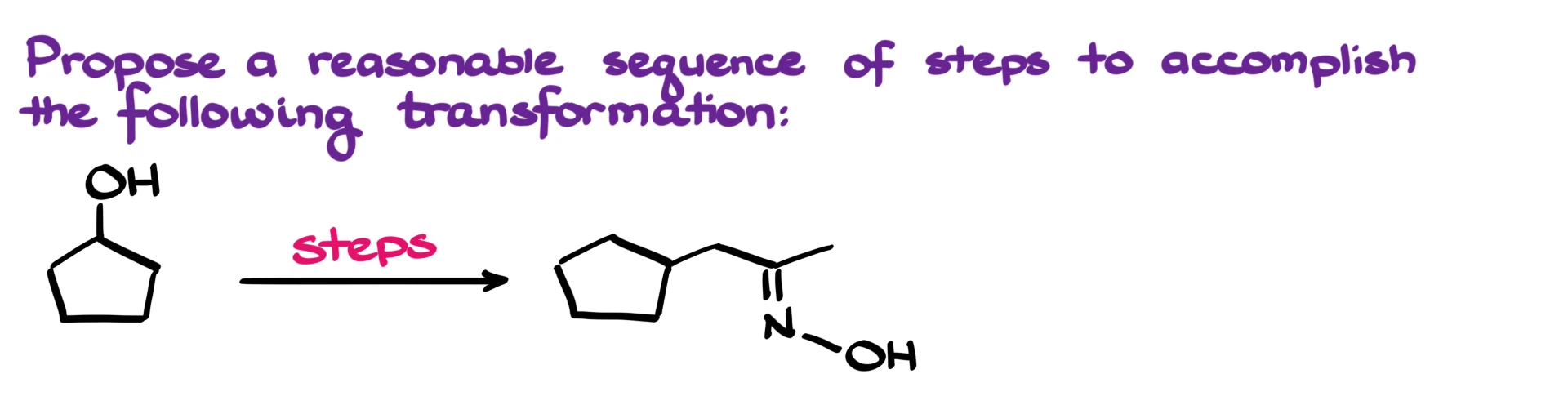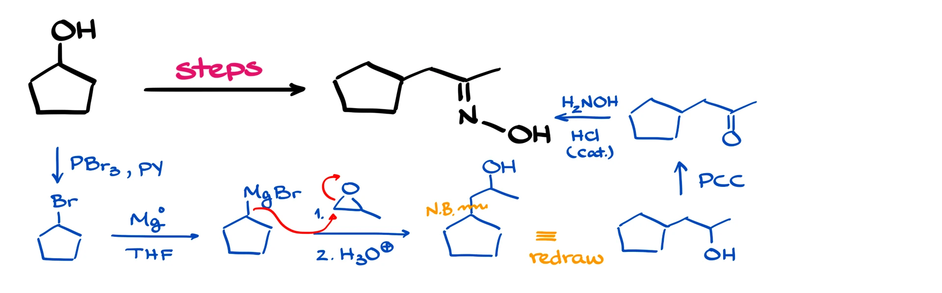 The only slightly tricky part you had to recognize here is that our functional group, the oxime, is basically just an imine analogue, and by now, hopefully you’re already familiar with how to make imines.