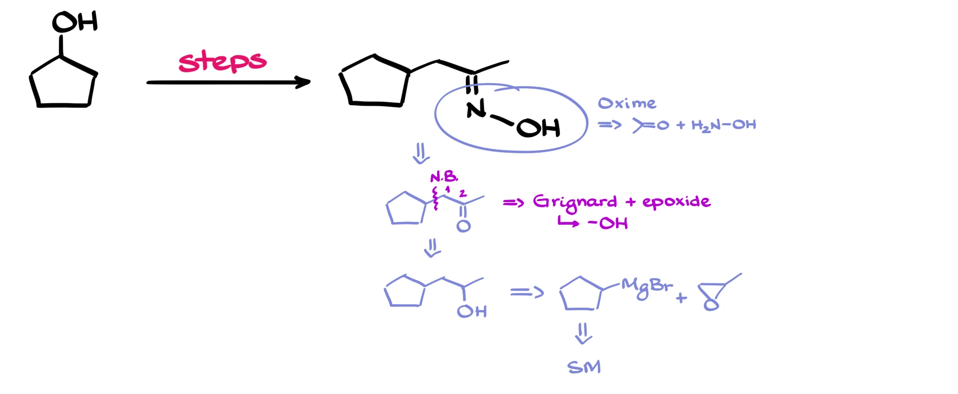 We also know that a Grignard reaction typically gives an alcohol, which means that our ketone must have come from that alcohol. And that alcohol, in turn, can be made easily by reacting the appropriate Grignard reagent with an epoxide, just like I mentioned a moment ago.