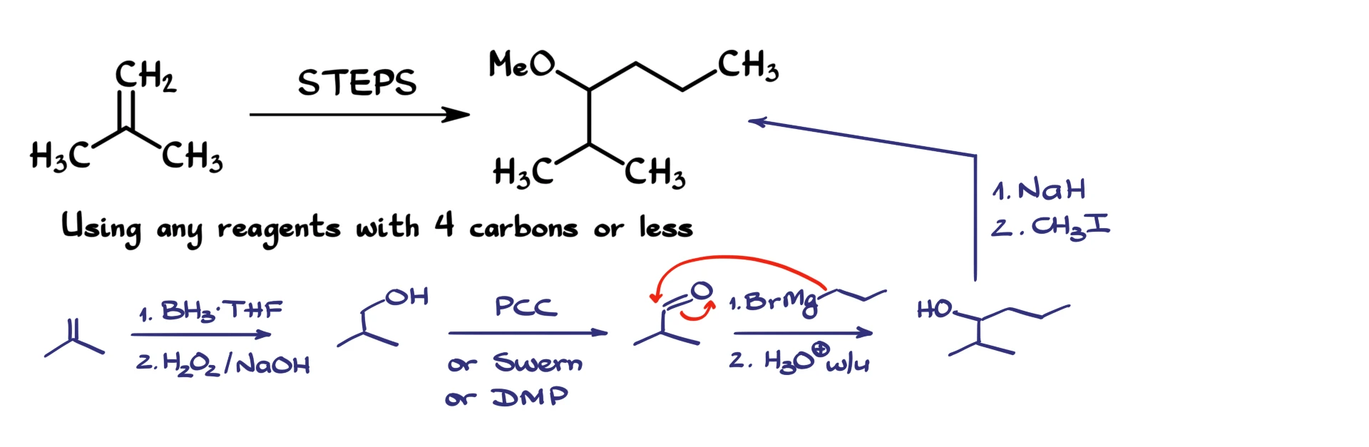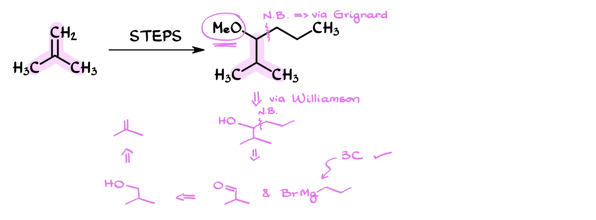If I form this new carbon–carbon bond using a Grignard reagent, I know I’m going to generate an alcohol at the position where the methoxy group eventually ends up. That means the methoxy group will probably be introduced later using a Williamson ether synthesis. Most likely, that will be the final step of the synthesis.