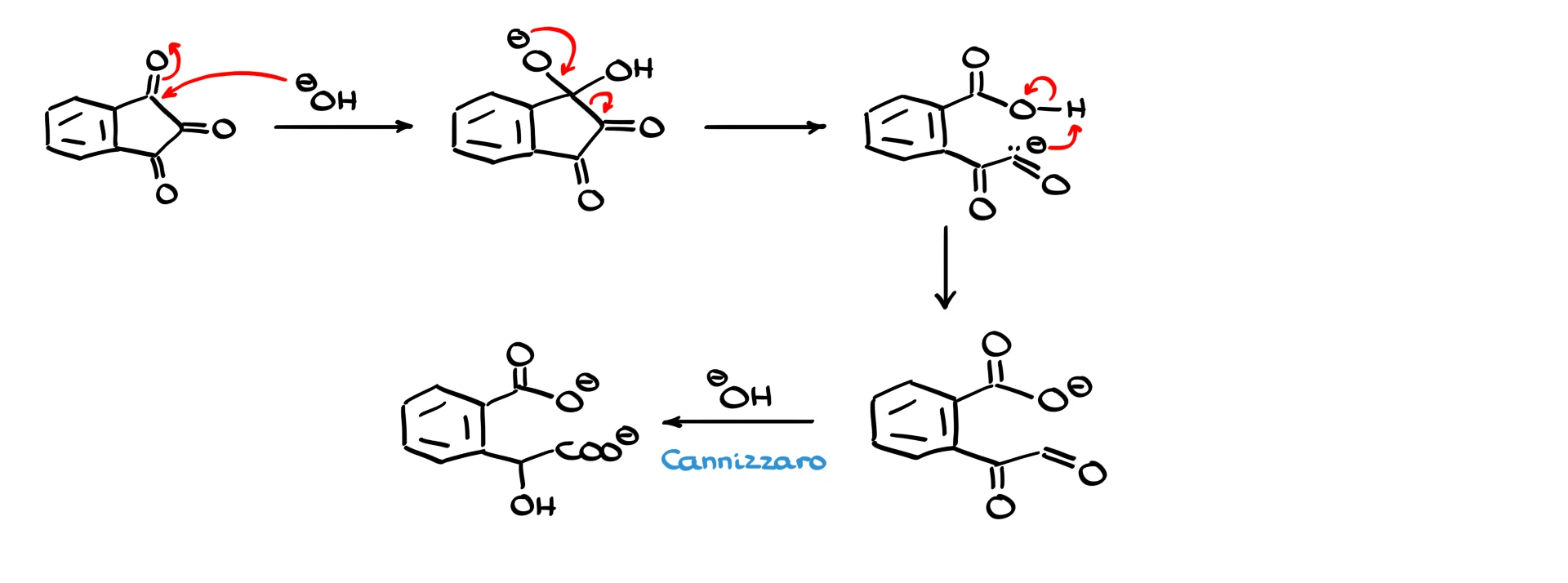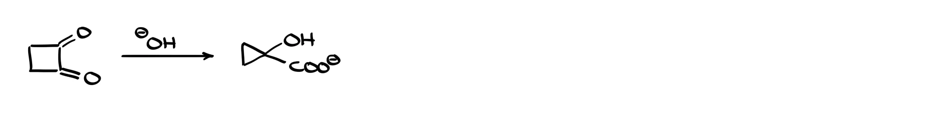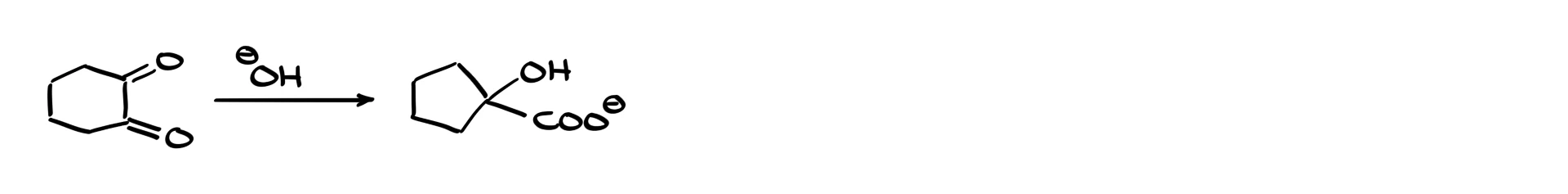 Mechanistically this follows the same logic. Hydroxide attacks one of the carbonyls, giving a tetrahedral intermediate. When the oxygen collapses back down, the aryl group migrates, a new carbon–carbon bond forms, and the ring contracts. A final proton transfer then gives the carboxylate product.