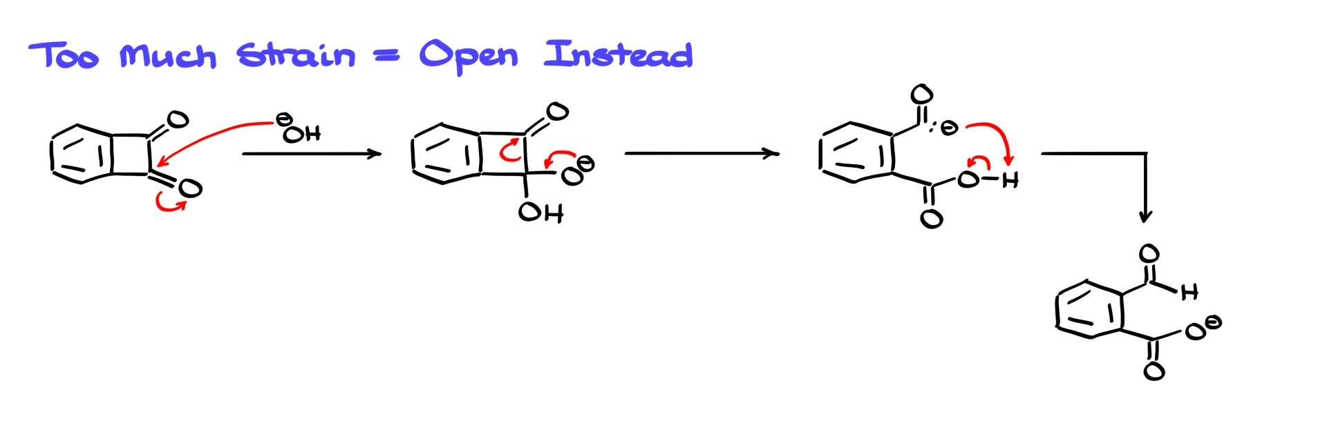 If we treat a highly strained system like that with base, hydroxide will still attack the carbonyl very efficiently, giving the familiar tetrahedral intermediate. However, when the electrons collapse back down, phenyl migration to form a three-membered ring is not feasible. Instead, a carbon–carbon bond breaks and the ring opens, producing a carbanion. This anion is not particularly stable, but it is still more stable than a hypothetical three-membered ring in such a strained system. A rapid proton transfer then occurs, giving a product that contains a carboxylate and an aldehyde.