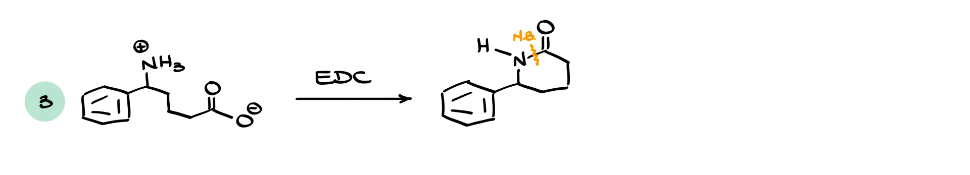 In the third example, we have a zwitterionic molecule with a carboxylate and a protonated amine. We use EDC as the coupling reagent. Both the starting material and EDC are water soluble, so the reaction can be run in aqueous solution. The amine attacks the activated carboxyl group, forming an amide. The final product is much less polar than the starting materials, so it often precipitates out of water, making purification very easy.