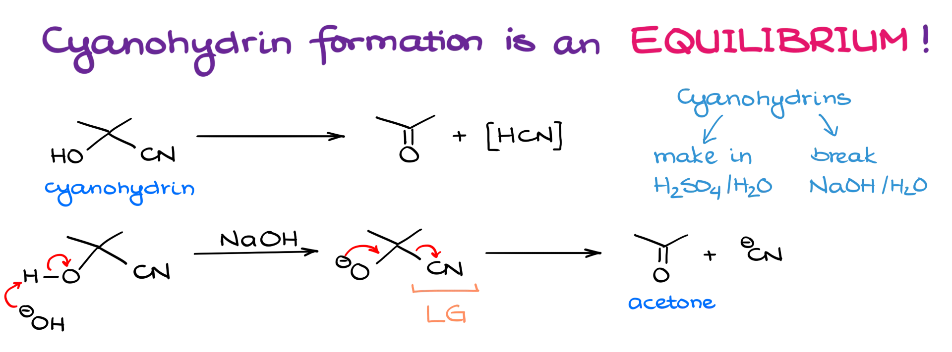 One really cool thing about this reaction is that it is an equilibrium. That means I can take the cyanohydrin and reverse the process to regenerate the original carbonyl compound and cyanide.