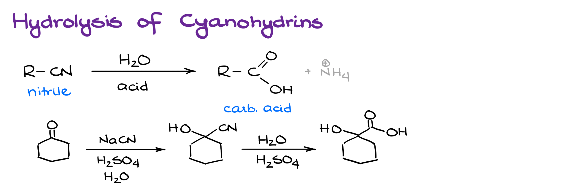 First, we can hydrolyze the nitrile group of a cyanohydrin to a corresponding carboxylic acid. Since nitriles can be hydrolyzed under acidic conditions to carboxylic acids, cyanohydrins can serve as convenient precursors to α-hydroxy carboxylic acids.