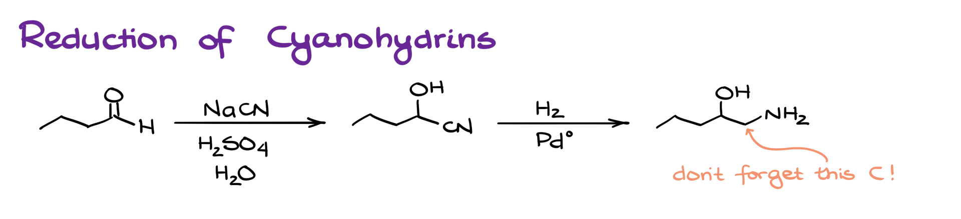 Another cool use for cyanohydrins is their ability to give amino alcohols after reduction of the nitrile group. For example, if I take a carbonyl compound and convert it into the corresponding cyanohydrin, I can then reduce the nitrile all the way to a primary amine.