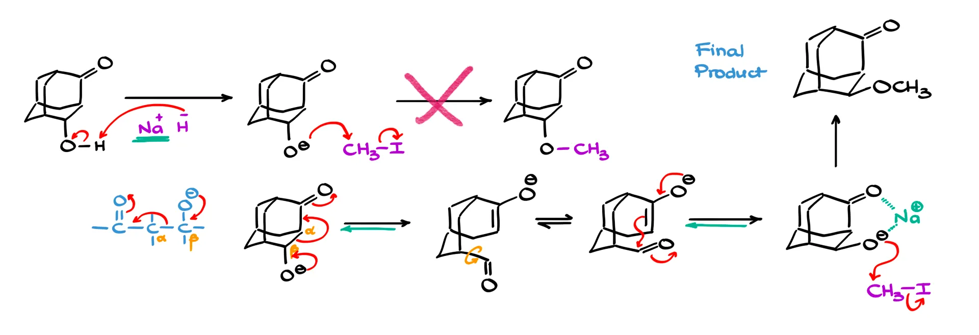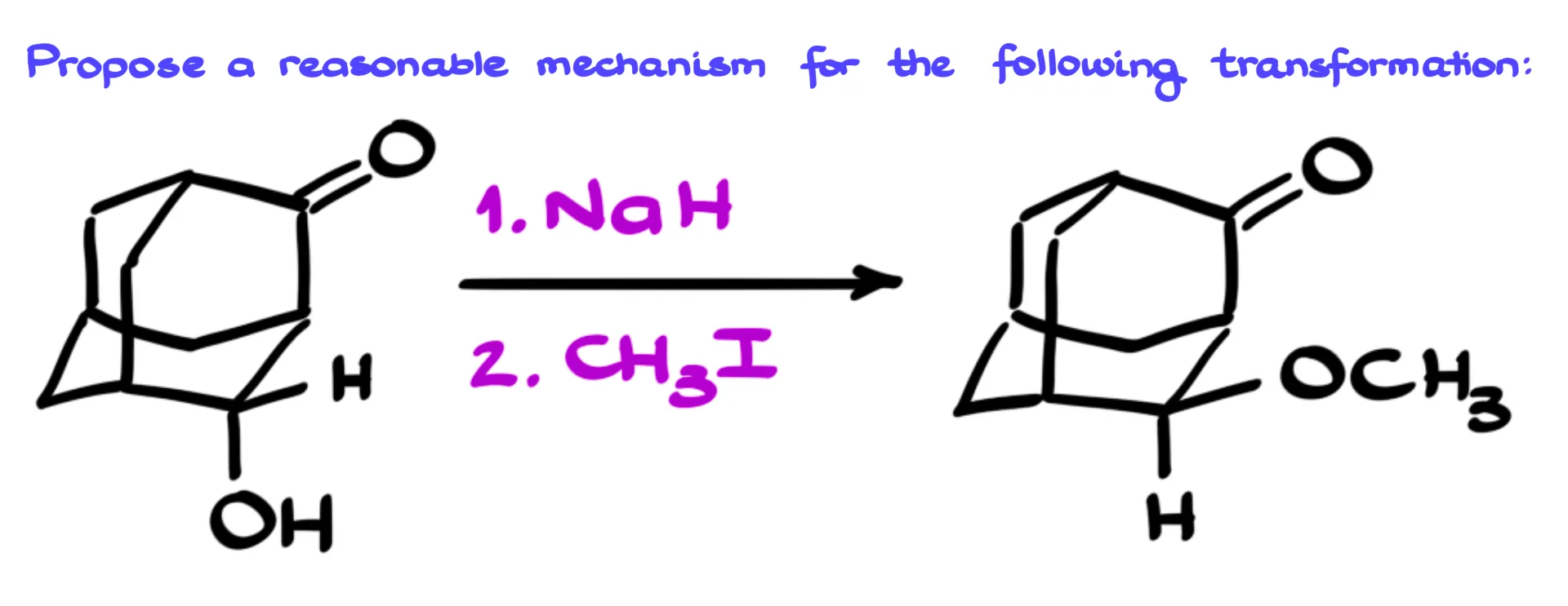 In this tutorial, I wanna talk about this interesting two-step reaction that, at first glance, looks like a simple Williamson ether synthesis. We start with an alcohol, treat it with sodium hydride, and then add an alkyl halide. So naturally, we’d expect to form the corresponding ether.