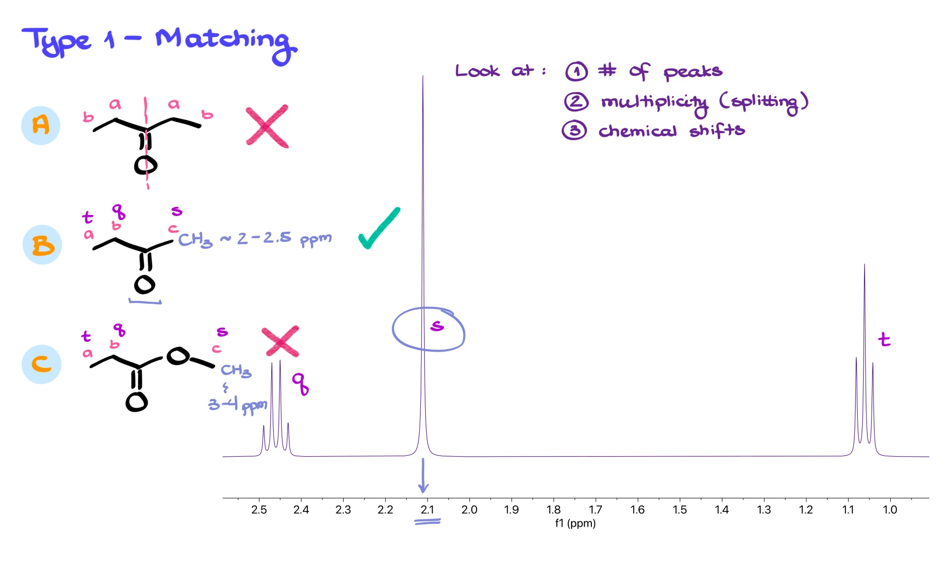 Molecule B should give a triplet, a quartet and a singlet. Molecule C should give the same pattern. If the spectrum contains a triplet, a quartet and a singlet, we still cannot distinguish the two. This is when chemical shifts become the deciding factor. A CH3 group next to a carbonyl typically appears around 2.0 to 2.5 ppm. A CH3 group sitting next to an oxygen appears further downfield, at about 3.0 to 4.0 ppm. In our spectrum the singlet sits at about 2.1 ppm, which matches a CH3 group next to a carbonyl. That immediately eliminates molecule C, leaving molecule B as the correct match.