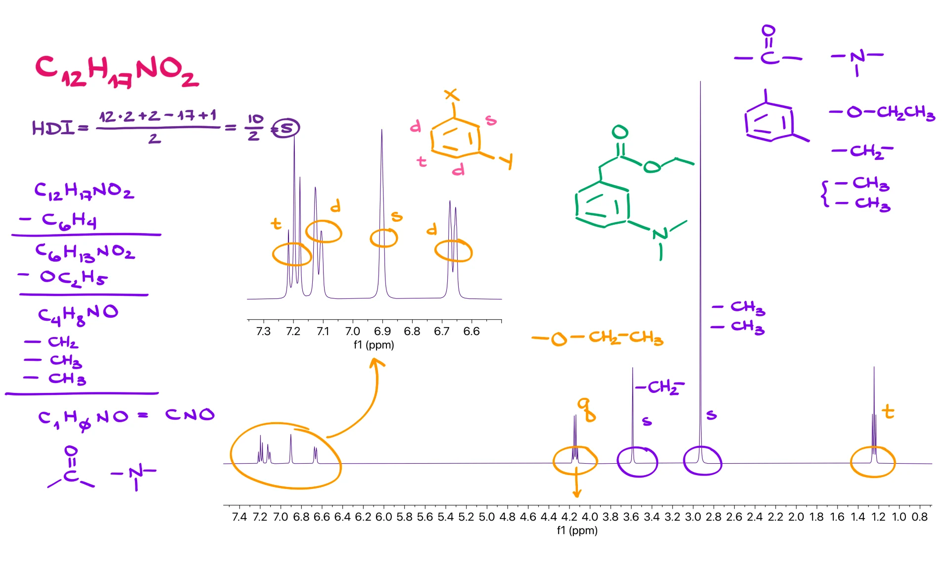 The next example follows the same method. From C12H17NO2 we again obtain a hydrogen deficiency index of 5, suggesting an aromatic ring. The aromatic region shows four distinct signals: a triplet, a doublet, a singlet and another doublet. That pattern is characteristic of a meta-substituted benzene ring. The spectrum also contains a quartet and a triplet, which is the unmistakable signature of an ethyl group. The quartet is shifted downfield to about 4 ppm, meaning that the CH2 group is attached to an oxygen. After removing the ring and the ethoxy fragment from the molecular formula, we examine the remaining signals. We find two singlets. One is small and the other is noticeably larger. The larger singlet must represent several equivalent hydrogens, most likely two identical CH3 groups. The smaller singlet can represent a CH2 fragment with no neighbors.