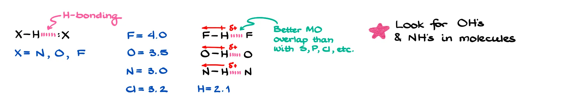 There are two main reasons for that. First, N, O, and F are the most electronegative elements. Because they pull electron density so strongly, the hydrogen attached to them becomes highly polarized and carries a significant δ+. That strong partial positive charge on hydrogen is essential. Without it, hydrogen bonding won’t happen. Second, these are second-period elements, which means their orbitals overlap well with the tiny hydrogen orbital. Larger atoms like sulfur, phosphorus, or even chlorine just don’t overlap as effectively, so they aren’t nearly as good for hydrogen bonding.