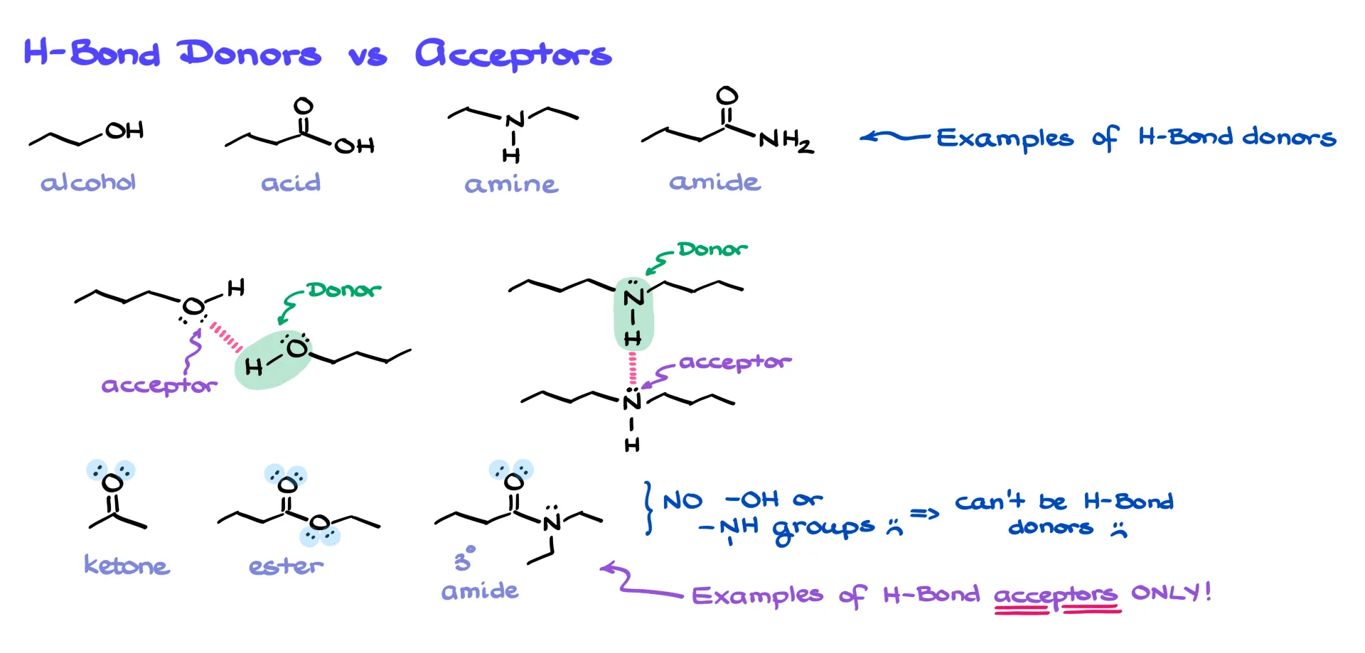 The group with the hydrogen is the hydrogen-bond donor, and the group with the electron pair is the acceptor. The same functional group can often be both. But here’s the tricky part: there are plenty of functional groups that contain oxygen or nitrogen but don’t have any hydrogens attached. Ketones, esters, and tertiary amides are classic examples. These groups can’t be donors because they lack N–H or O–H bonds, but they can still act as acceptors thanks to their lone pairs.