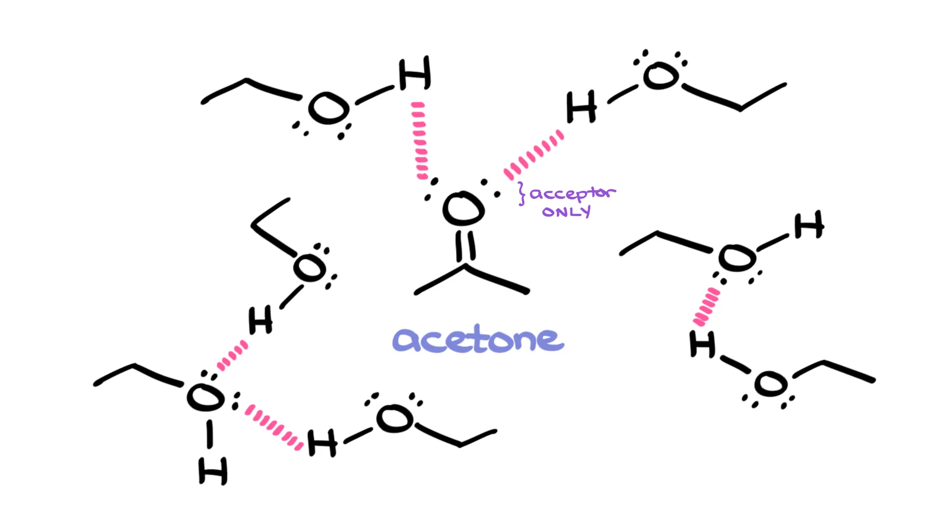 Take acetone, for instance. On its own, acetone doesn’t hydrogen-bond because it can only accept. But if you dissolve it in ethanol, suddenly it participates. Ethanol can donate and accept, while acetone accepts. Together, they form hydrogen bonds. So remember: just because a molecule can’t be both a donor and an acceptor doesn’t mean it can’t participate at all. Context matters.