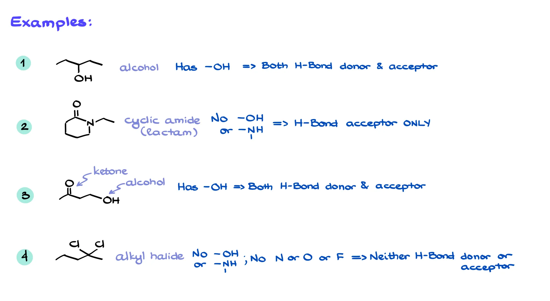 Let’s think through some examples. If I show you an alcohol, it has an O–H, so it can both donate and accept. If I show you a lactam, or cyclic amide, it doesn’t have O–H or N–H, but it does have N and O atoms, so it can accept. A molecule with both a ketone and an alcohol can donate and accept, while an alkyl halide—despite chlorine being electronegative—won’t participate because we don’t count C–Cl bonds for hydrogen bonding.