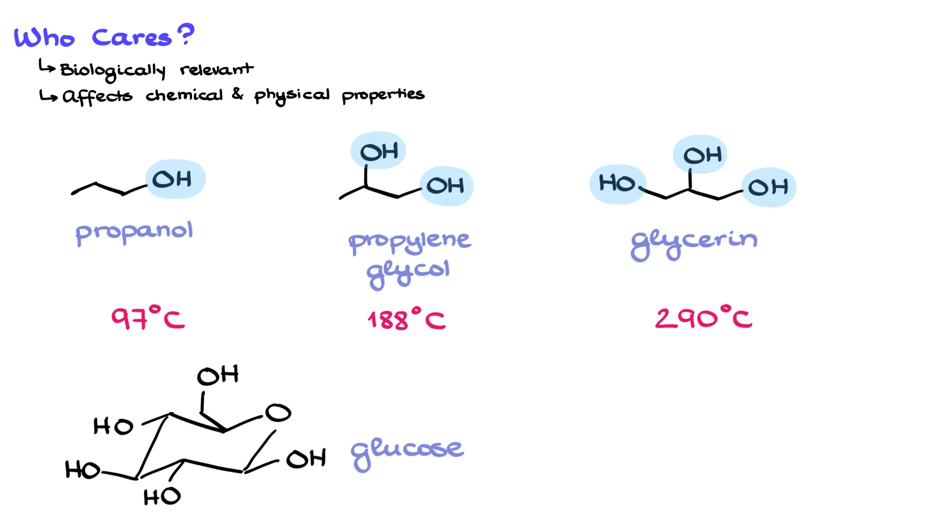So why do we care? Well, hydrogen bonding plays a huge role in both chemical and physical properties. Without it, life as we know it wouldn’t exist. For example, compare propanol, propylene glycol, and glycerol. These molecules differ only in how many O–H groups they have, but their boiling points are drastically different: 97 °C for propanol, 188 °C for propylene glycol, and 290 °C for glycerol. Each extra O–H raises the boiling point by about 90 degrees. Add even more O–H groups, as in glucose, and the compound is a solid. Try heating it, and instead of boiling it just decomposes into caramel. The hydrogen bonds are so strong that the molecules literally break apart before they can separate from one another.