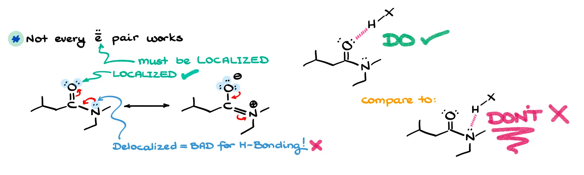 The second mistake is assuming any lone pair can act in hydrogen bonding. Not all electron pairs are equal. Only localized lone pairs participate effectively. If a lone pair is delocalized through resonance, it’s much less available. For example, in an amide, both oxygen and nitrogen have lone pairs, but the nitrogen’s are delocalized. That means hydrogen bonding will primarily occur through the oxygen. Instructors love to use this as a trick question, so be careful.