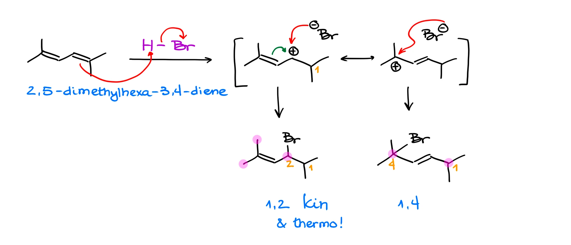 For instance, if I react 2,5-dimethylhexa-3,4-diene with HBr, we’ll get 1,2-product, which is our kinetic product, and we’ll get 1,4-product. But if we look at the double bond in this case, we’ll see that the double bond in the 1,2-product has three substituents, while the double bond in the 1,4-product only has two. This means that the 1,2-product in this case is both kinetic and thermodynamic! This means that 1,2-product here will always be the major product regardless of the conditions. So, always make sure to analyze your molecules and never blindly assign the kinetic and thermodynamic products before you look carefully at your molecules!
