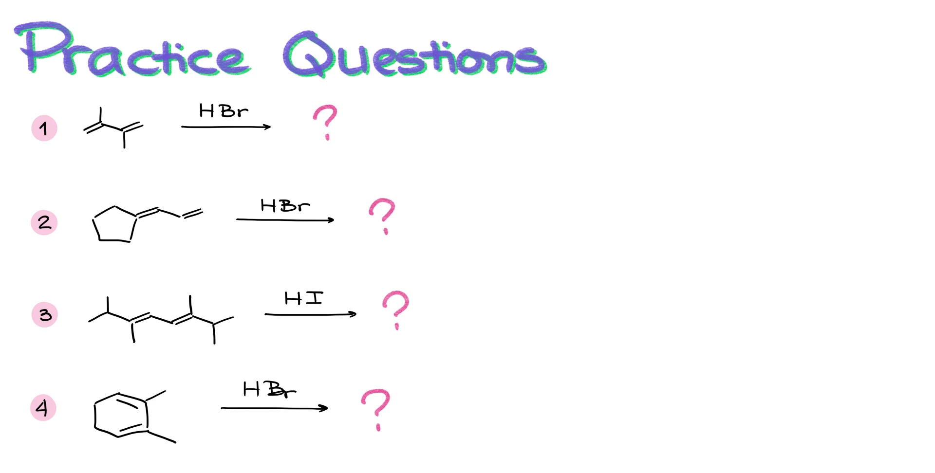 Conjugated alkenes have a lot of similarities with regular alkenes. However, due to the conjugated nature of the molecule, they have specific reactivity that we do not see in isolated alkenes. One of the typical reactions of alkenes—hydrohalogenation—is also something that we see for the dienes as well. However, you no longer can approach it as a simple “Markovnikov’s addition” reaction. Hydrohalogenation of dienes brings its own set of challenges. So, let’s talk about the details of this reaction and why it is different from a simple hydrohalogenation.