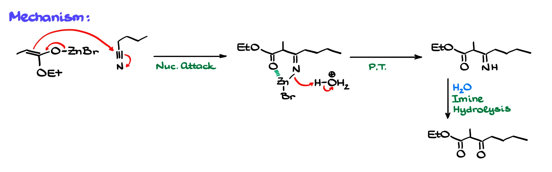 Mechanistically, the zinc enolate attacks the nitrile carbon, forming an intermediate in which zinc coordinates to both nitrogen and oxygen. After acidic workup, this intermediate is converted into an imine, which can then be hydrolyzed to give a dicarbonyl compound.