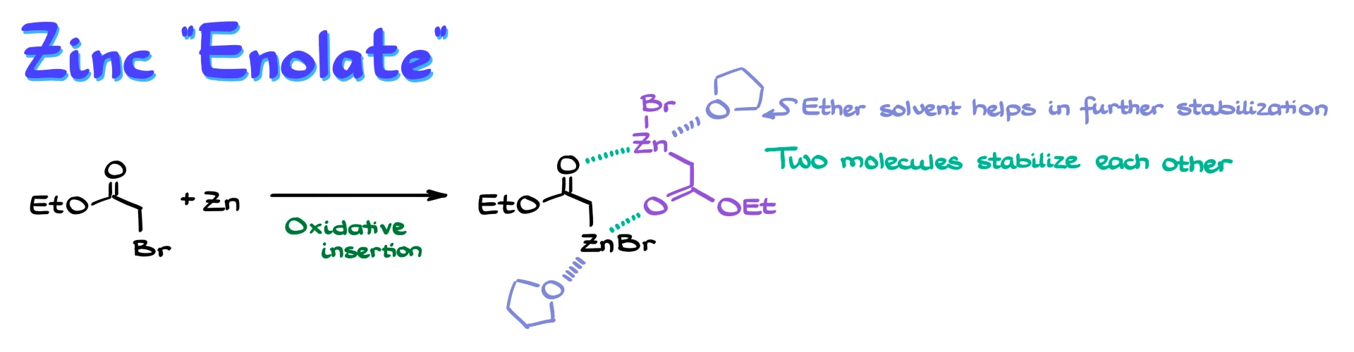 At this stage, we do not yet have a true enolate. However, in solution, another molecule of this organozinc compound can interact with it, forming a dimeric complex that helps stabilize the system. In addition, the reaction is typically carried out in a polar aprotic solvent, usually an ether such as THF, which also coordinates to zinc and stabilizes the overall structure.