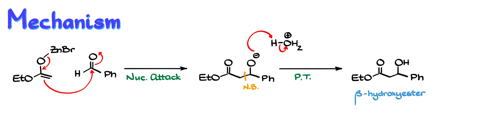 For example, if we react a zinc enolate with benzaldehyde, the enolate attacks the carbonyl carbon. The electrons from the carbonyl move onto oxygen, forming an alkoxide intermediate. This creates a new carbon–carbon bond. After an acidic workup, the alkoxide is protonated, giving a β-hydroxy ester as the final product.