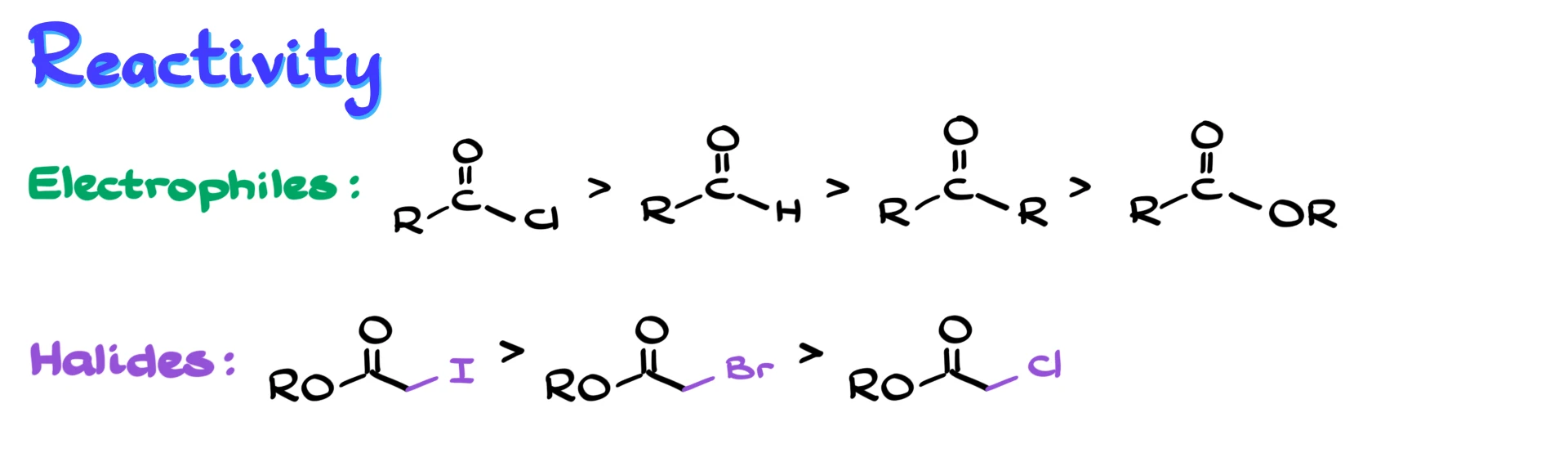 In terms of reactivity trends, nothing too surprising happens. Among electrophiles, acid chlorides are more reactive than aldehydes and ketones, which are more reactive than esters. For the halides, iodides are the most reactive toward zinc, while chlorides are the least reactive. In fact, many α-chloro esters are so unreactive that the reaction often does not work well. That is why α-bromo esters are the most commonly used substrates, they strike a good balance between reactivity and availability.