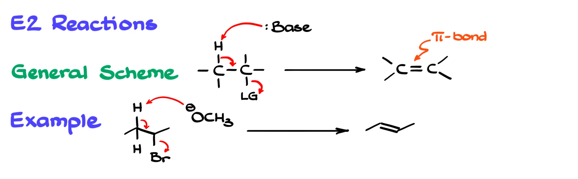 For instance, if we take 2-bromobutane and react it with methoxide, the methoxide removes a β-hydrogen. At the same time, the leaving group is expelled, and we form an alkene, specifically 2-butene.
