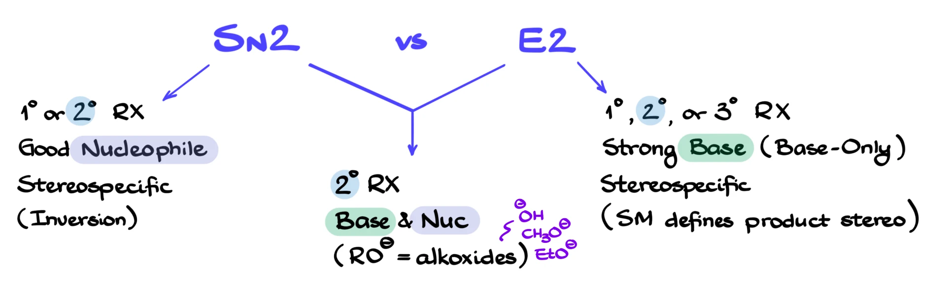 So the main takeaway is that SN2 and E2 compete primarily with secondary substrates and reagents that can act as both bases and nucleophiles. In those cases, elimination usually has the edge.