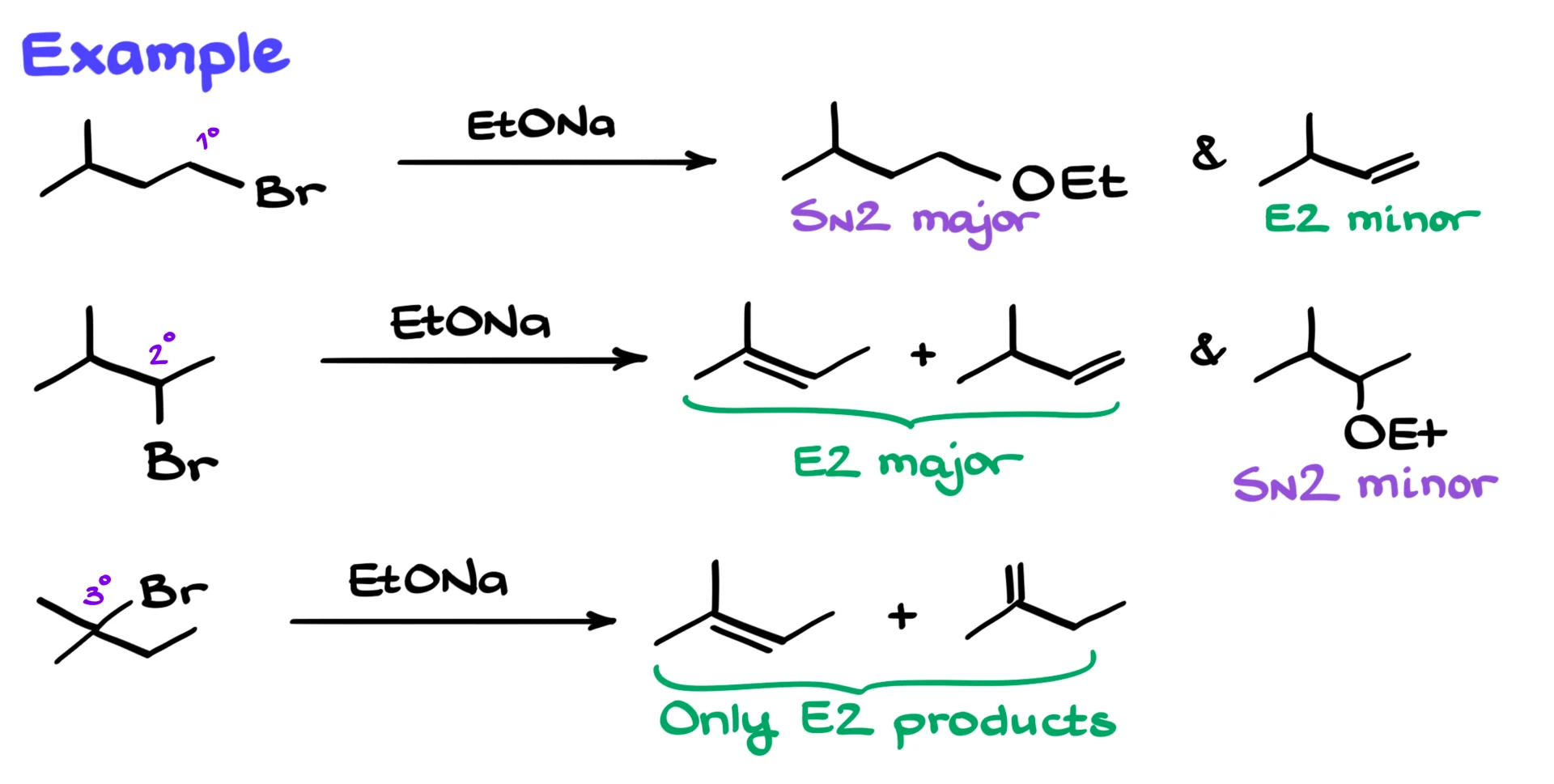 For example, if you react a primary alkyl halide with sodium ethoxide, you will get both substitution and elimination products, but the SN2 product will be the major one. If you instead use a secondary alkyl halide, you will again get both types of products, but now the elimination products will dominate. Finally, if you start with a tertiary alkyl halide, the reaction will proceed almost exclusively through E2, giving only alkene products.