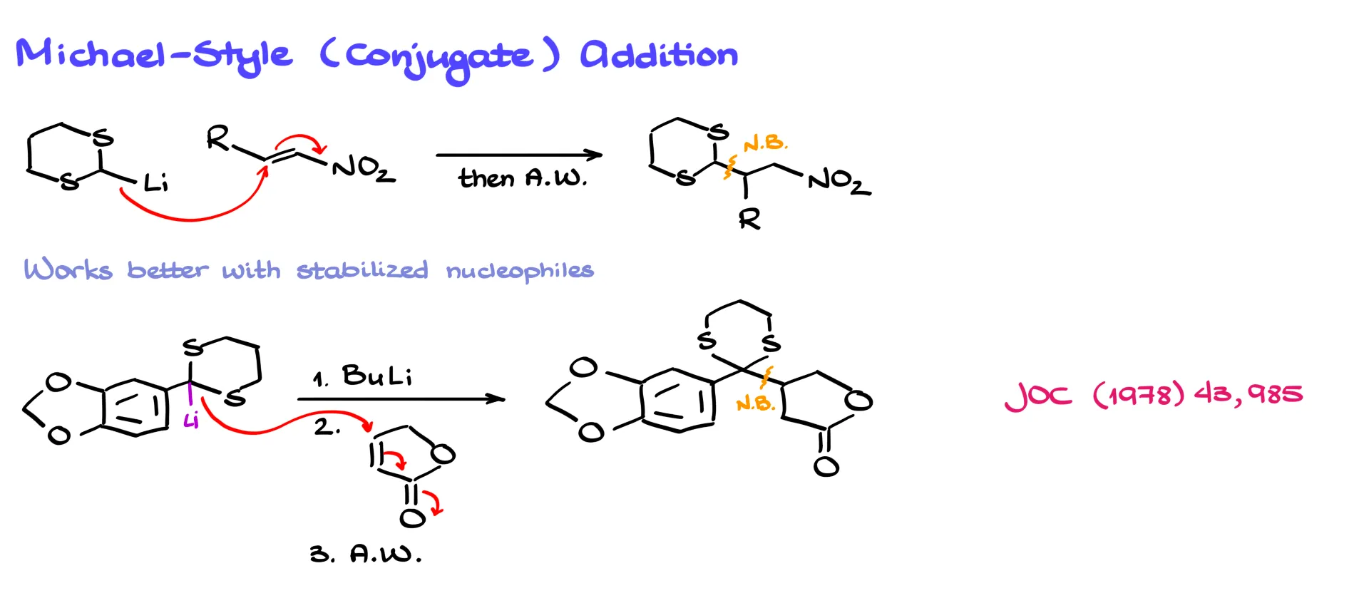 The second situation is when the lithium derivative is resonance stabilized. For example, if the negative charge can be delocalized into a phenyl ring, the reagent behaves more like a classical Michael donor. In that case the nucleophile attacks the β position of the α,β-unsaturated system and forms the conjugate addition product after acidic workup.
