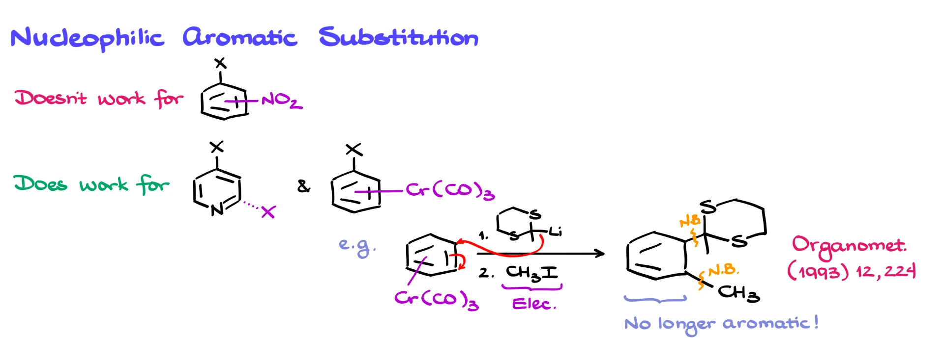 Finally, lithium derivatives of thioacetals can also participate in nucleophilic aromatic substitution. Nitro-substituted aromatic rings generally do not work well because nitro groups can undergo unwanted electron transfer with organolithium reagents. However, the reaction works better with electron-deficient systems such as pyridine derivatives or aromatic rings complexed with chromium.