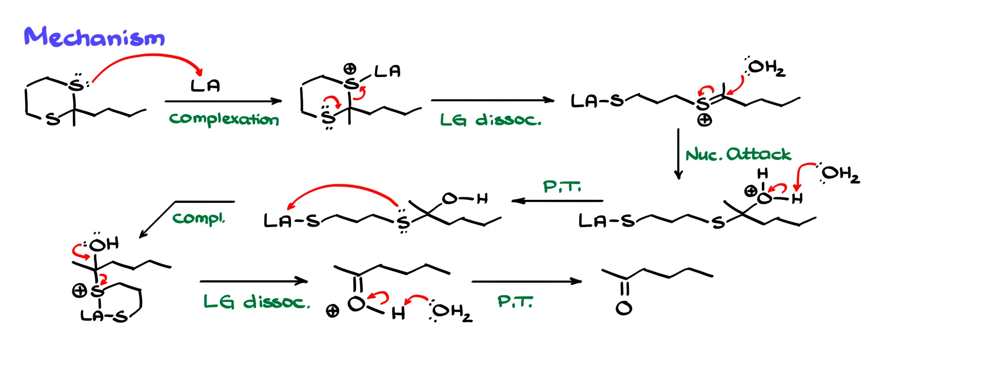 Mechanistically, sulfur first coordinates to the Lewis acid. This complex then breaks apart, generating an intermediate with a carbon–sulfur double bond. Water attacks the electrophilic carbon, forming a new intermediate. After a proton transfer and another coordination step with the Lewis acid, the sulfur-containing group leaves. A final deprotonation step releases the free carbonyl compound.