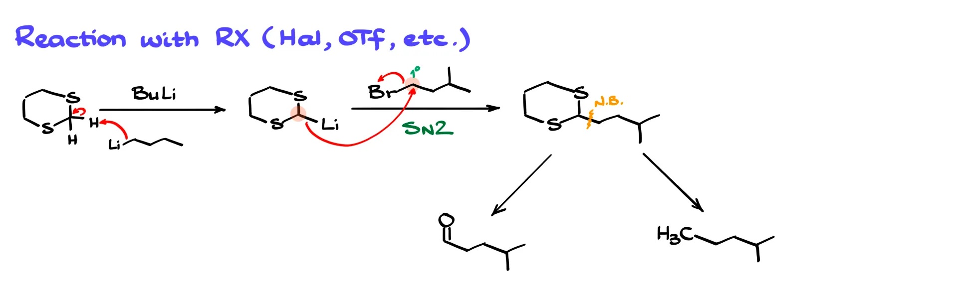 Starting with a thioacetal, we treat it with butyllithium to form the lithium derivative. Then we react it with an alkyl bromide. The nucleophile performs an SN2 reaction, displacing the leaving group and forming a new carbon–carbon bond.