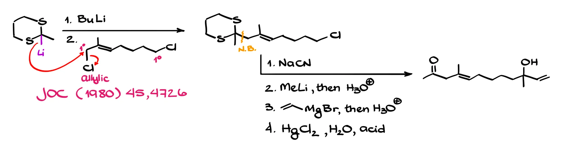 Let’s look at a literature example. We start with a thioacetal and treat it with butyllithium to form the lithium derivative. In the next step we react it with an electrophile that contains two primary chlorides: one allylic and one regular.