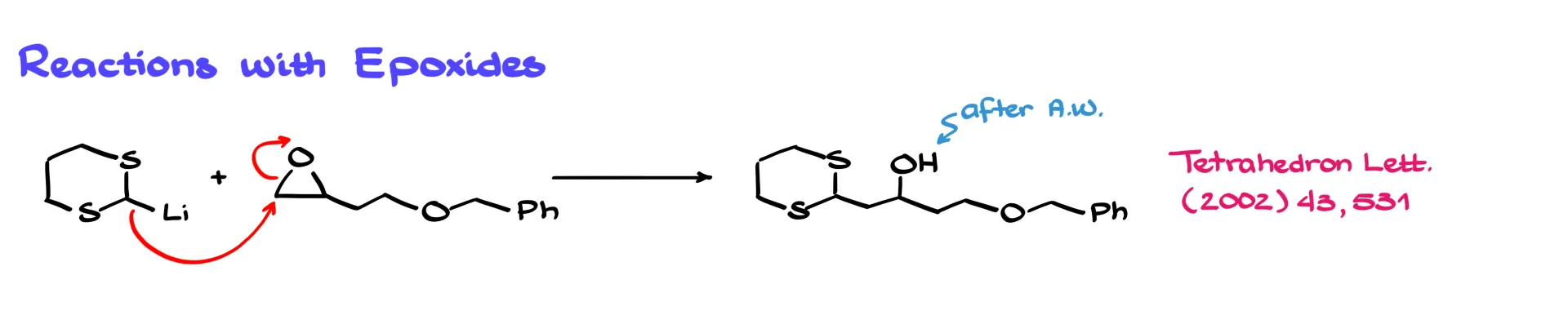 Imagine starting with a simple thioacetal. Treating it with butyllithium forms the lithium derivative. If we react that with an epoxide derived from cyclohexane, the nucleophile opens the epoxide and forms a new carbon–carbon bond. After acidic workup we obtain a product containing a newly formed OH group.