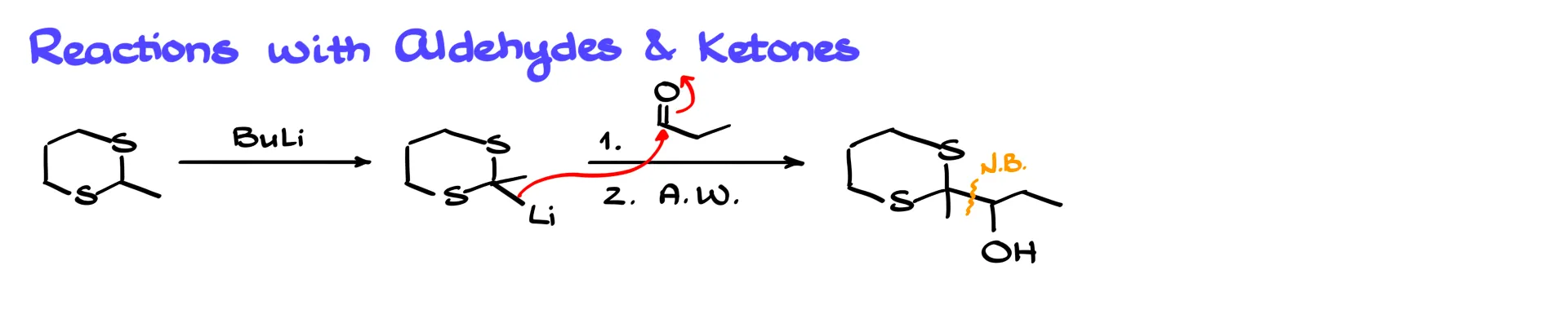 We convert the thioacetal into its lithium derivative and react it with an aldehyde, such as propanal. The nucleophile attacks the carbonyl carbon, forming a new carbon–carbon bond. After acidic workup we obtain the corresponding alcohol.