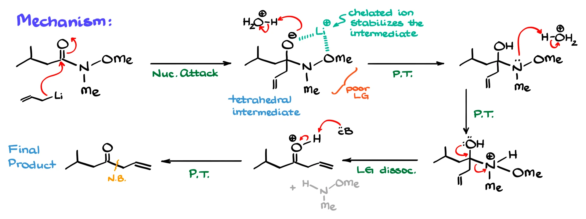 There are two key reasons. First, the amide fragment is a poor leaving group, making it difficult to expel. Second, and more importantly, the metal ion, lithium or magnesium, coordinates with both oxygen atoms, the former carbonyl oxygen and the methoxy oxygen. This creates a chelated complex that stabilizes the tetrahedral intermediate.