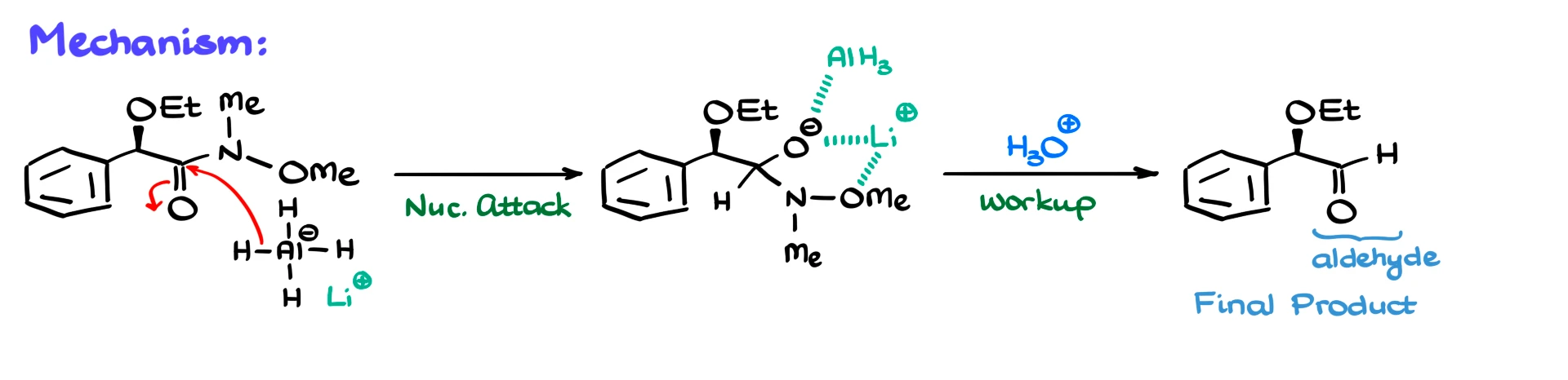 After acidic workup, the intermediate collapses, and we obtain the aldehyde.
