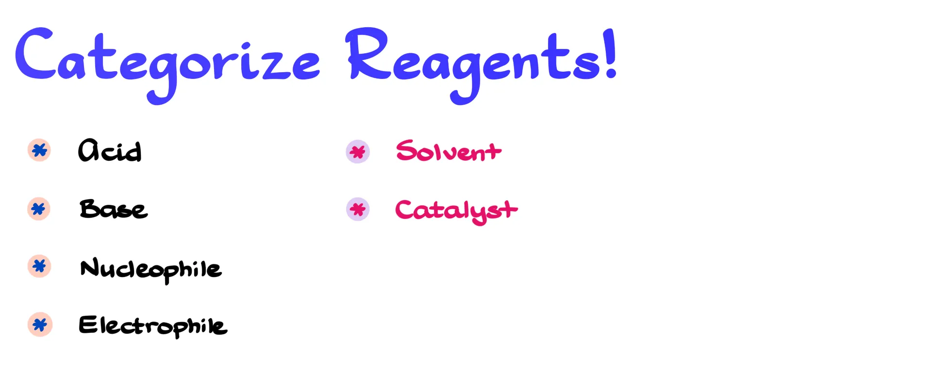 Instead, you need to focus on the building blocks. Every reagent can be understood in terms of a few roles: acid, base, nucleophile, or electrophile. Solvents and catalysts matter too, you need to recognize those as part of the system. Once you start thinking in these terms, reactions stop being memorized facts and start becoming logical patterns. A strong base means something will get deprotonated. A nucleophile and an electrophile mean there will be an attack. Now you’re not recalling—you’re reasoning.