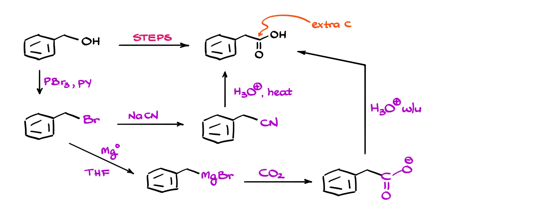 Here is a fairly typical second-semester organic chemistry question: we start with benzyl alcohol and need to convert it into a carboxylic acid. The first thing I notice is that the product has an extra carbon. That suggests an approach where we convert the alcohol into the corresponding bromide, then treat it with sodium or potassium cyanide to form the nitrile, and finally hydrolyze it to get the carboxylic acid. Alternatively, we could use a Grignard reagent and perform a carboxylation with carbon dioxide.