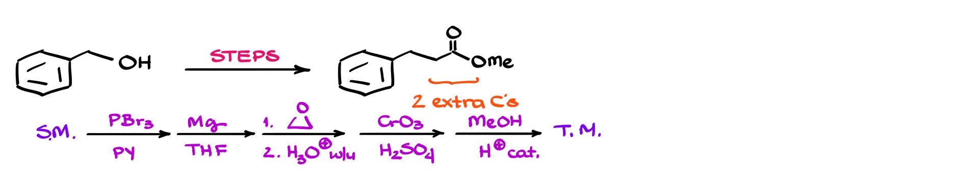 Now consider a slightly different example. If the product has two extra carbons instead of one, that previous approach no longer works. The idea is similar, but that small structural change forces a completely new sequence. So now you feel like you need another trick, another rule, another recipe—and that’s the trap. Organic chemistry is not your grandma’s recipe book. You can’t collect enough recipes to succeed on exams.